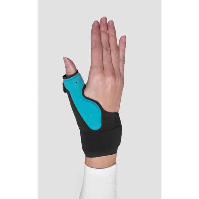 The OrthoRhiza is made of the most premium soft, breathable velour with air holes for ultimate patient comfort. The OrthoRhiza has inbuilt malleable and adjustable aluminium supports covering the dorsal and volar aspects of the thumb and also encompassing the circumference of the proximal phalanx. This provides superb immobilization of the metacarpophalangeal (MCP) joint and also moderate carpometacarpal joint support.