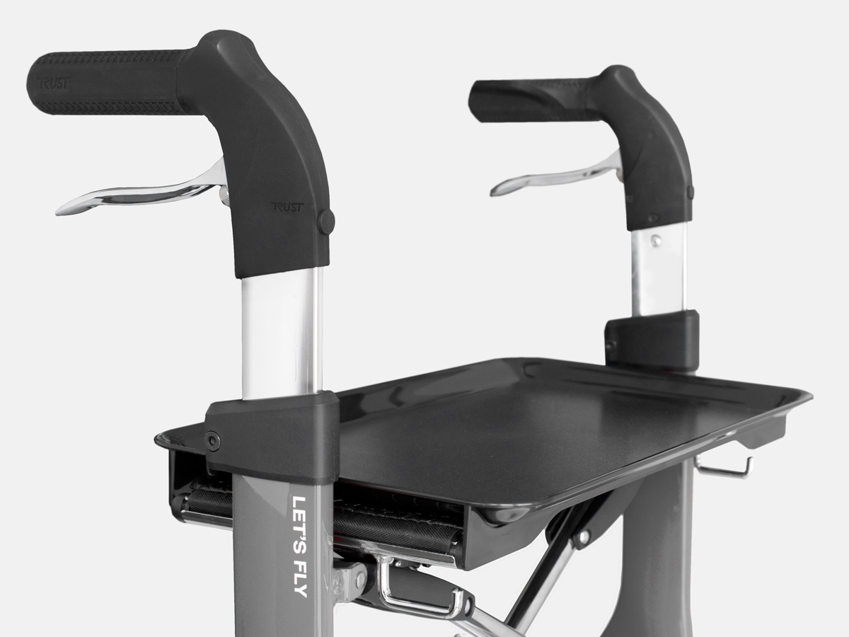 The rear wheels of Let’s Fly have built-in soft rubber suspension to give a softer ride when you are walking on rough surfaces. TrustCare’s outdoor rollators are the first in the world with this feature.