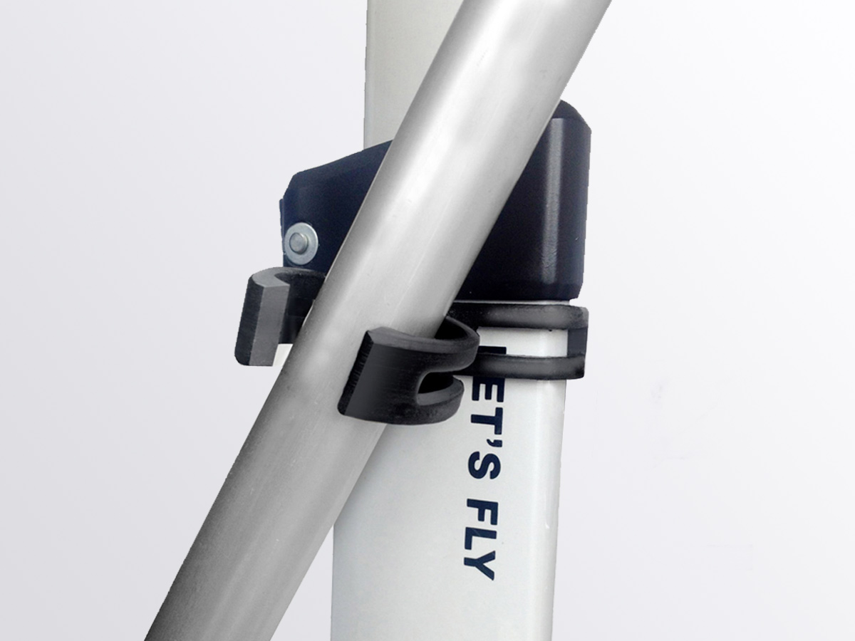 The elegant crutch holder consists of two parts, an upper and lower part, and is used to take along a crutch or a walking stick with the rollator. Simple snap mount.